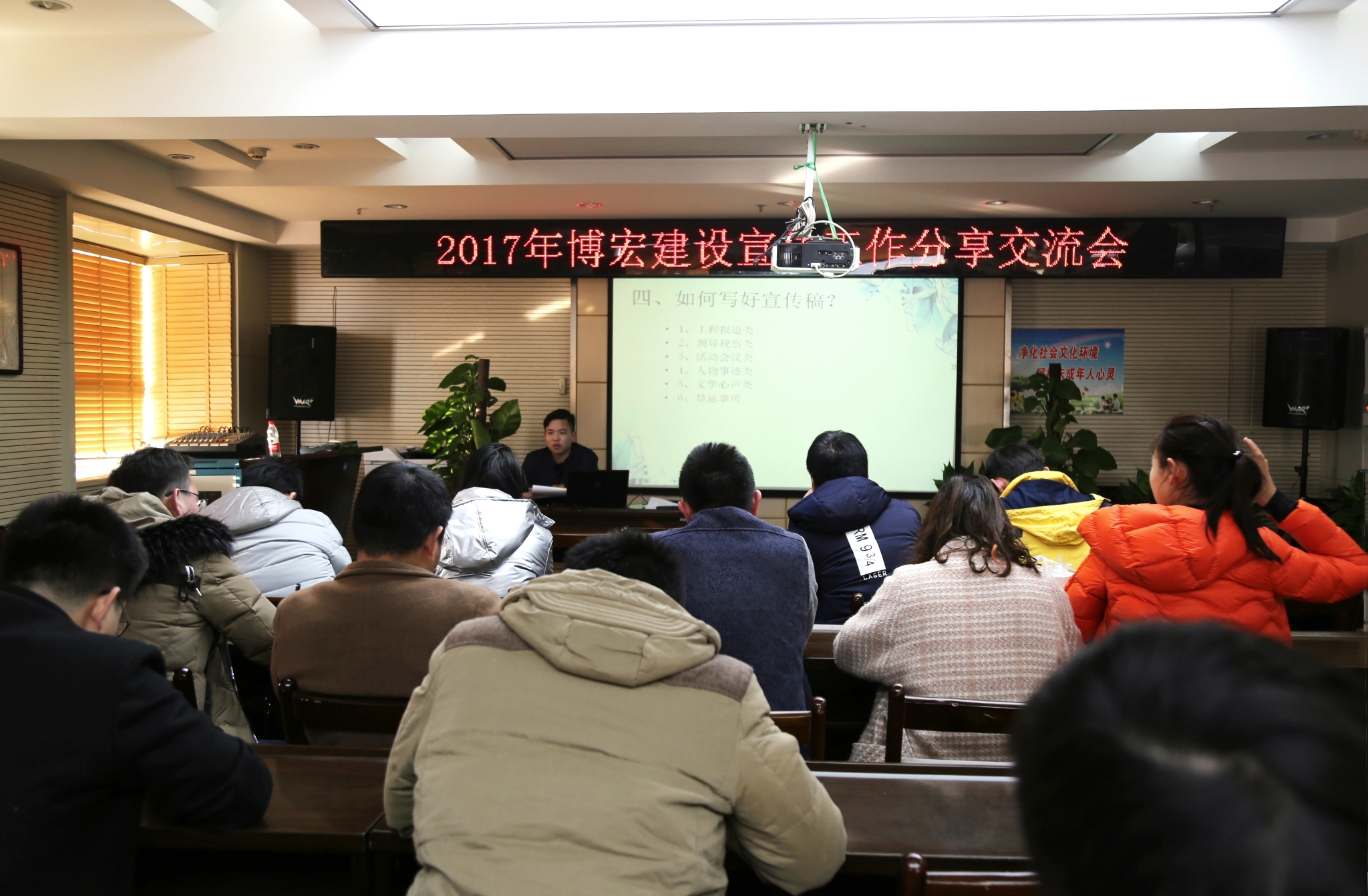 為強化職工宣傳工作意識,熟悉工作流程,提升工作技能,1221日,博宏建設2017年宣傳工作分享會在公司會議室順利召開,來自公司各個部門及項目的20余名宣傳員齊聚一堂共同學習交流,分享工作心得。