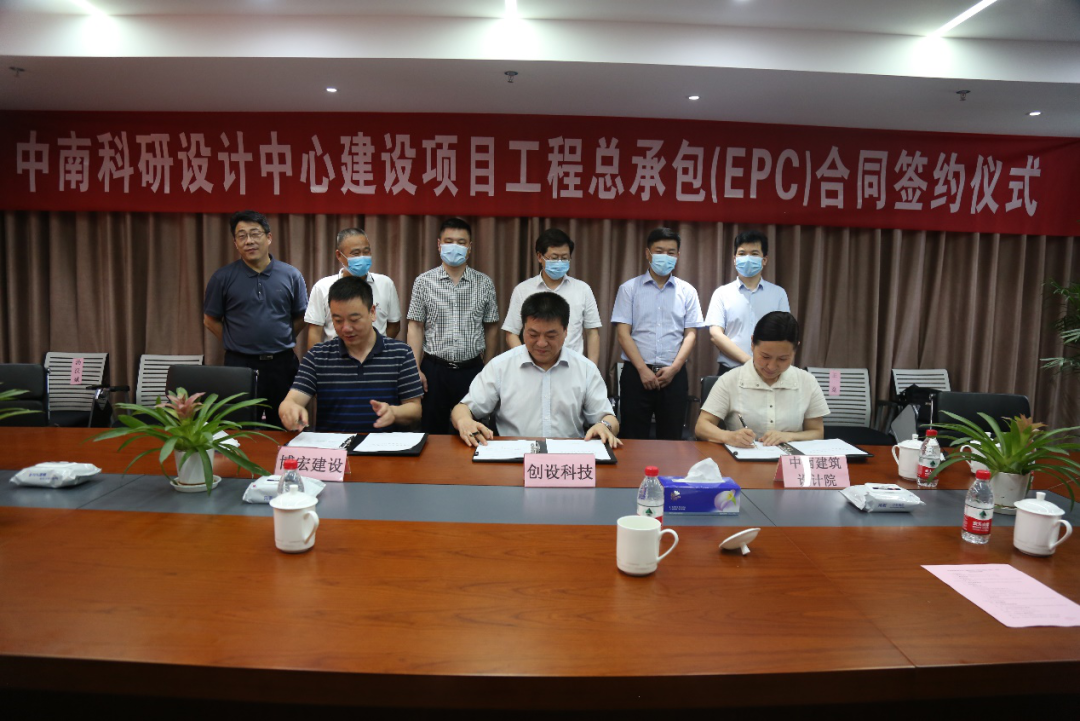 武漢創設科技發展有限公司董事長周忠義與中南建筑設計院股份有限公司總經理楊劍華、武漢博宏建設有限公司董事長錢濤簽署EPC工程總承包后,楊劍華表示:中南建筑設計院作為EPC工程總承包聯合體牽頭方,將增強政治意識,作為頭號工程來抓,精心設計、整體謀劃,高質量推動項目建設工作。虞志鵬表示武漢博宏建設有限公司作為中南科研設計中心EPC工程總承包聯合體成員,將全面抓好工程施工和現場管理,做出讓甲方滿意的高質量工程。