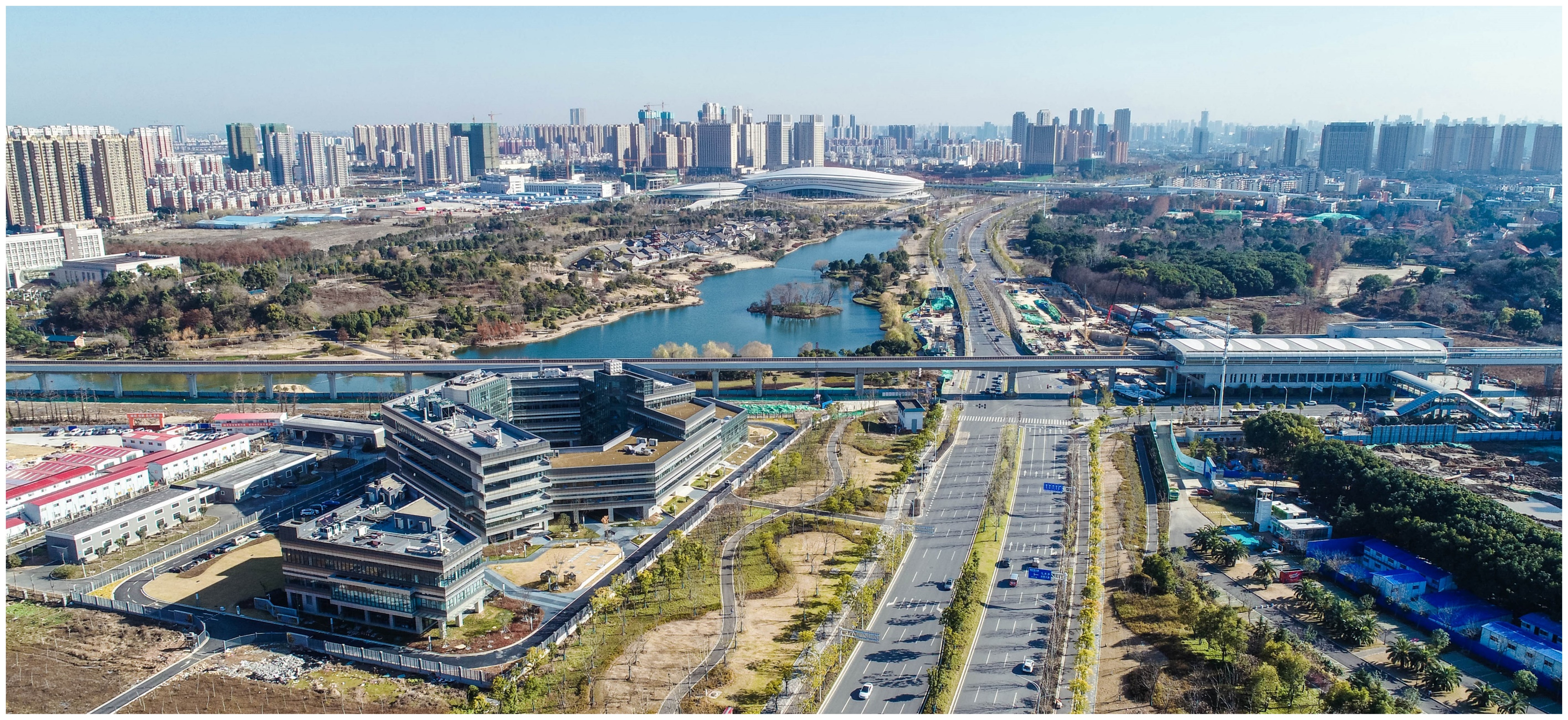 與軍運(yùn)會(huì)主場(chǎng)館一湖之隔,遙相呼應(yīng),由博宏建設(shè)承建的武漢食品檢驗(yàn)檢測(cè)中心從建筑外形上就有強(qiáng)烈的現(xiàn)代感、科技感,項(xiàng)目由綜合樓、動(dòng)物實(shí)驗(yàn)樓兩大部分組成,以苯環(huán)的“六邊形分子式”為基礎(chǔ)的抽象設(shè)計(jì)元素、“分子體有機(jī)生長(zhǎng)”的理念,穩(wěn)健的橫向線條,六邊形所形成的棱角、層與層之間退進(jìn)所衍生出的建筑空間,無不彰顯出現(xiàn)代科技之美。